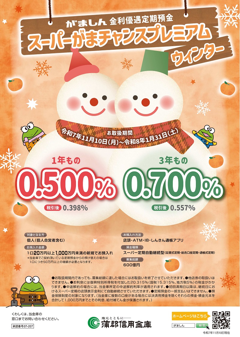 | 2025/11/10 | ![]() | 金利優遇定期預金「スーパーがまチャンスプレミアムウィンター」取扱開始のお知らせ |