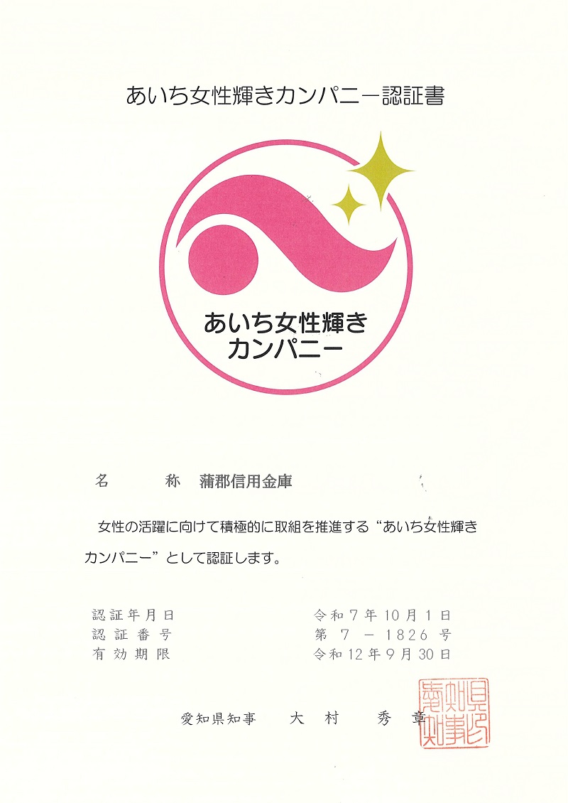 当金庫は2025年10月1日、愛知県が実施する「あいち女性輝きカンパニー」に認定されました。