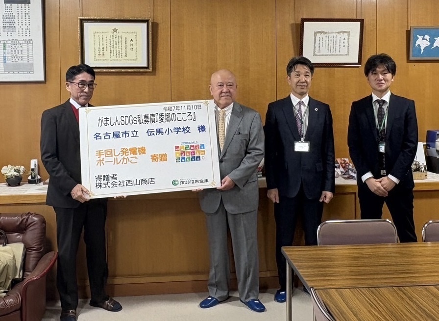 蒲郡信用金庫名古屋南支店の取引先である株式会社西山商店様は、11月10日、名古屋市立伝馬小学校へ「ボールかご」および「手回し発電機」を寄贈されました。