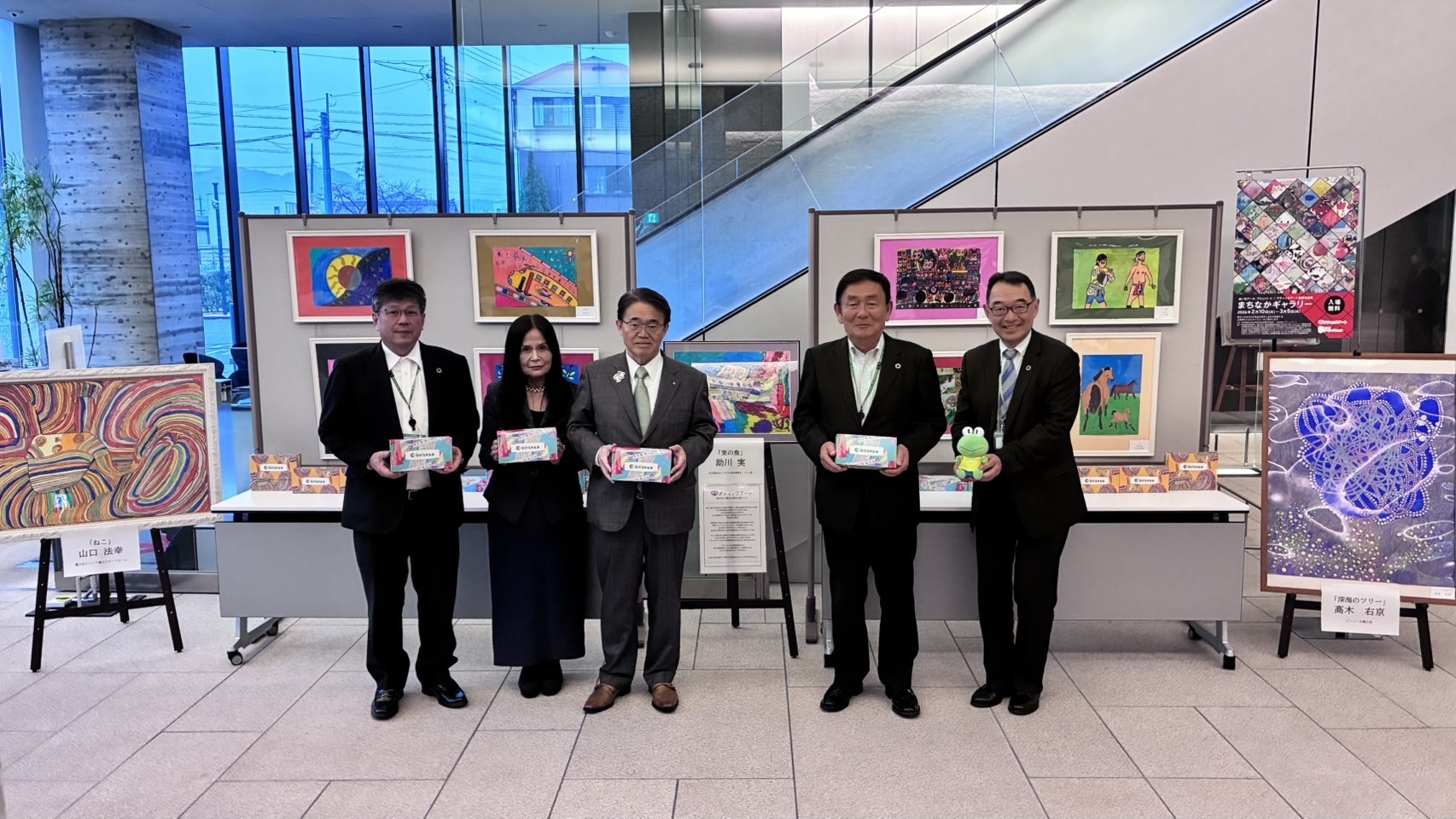 蒲郡信用金庫は、一般社団法人アティックアート(須藤伸枝理事長)の活動趣旨に賛同し、障がいを乗り越え、自立を目指す才能あるアーティストを応援しています。同取組の一環として開催している作品展「まちなかギャラリー」を本店ビル1階で3月5日(木)まで開催。11点の作品を展示し、小さなギャラリーを設営しております。