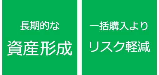 ・ドル・コスト平均法を活用した時間分散の効果によりリスクを軽減できます。価格の水準にかかわらず一定額を購入することで購入単価が平均化されることから、まとめて購入する場合と比べて価格変動リスクを軽減する効果が期待できます。