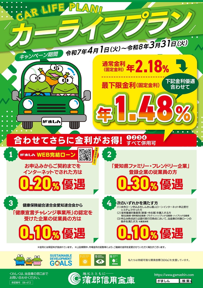 自家用車(二輪車・電動アシスト自転車を含む)購入のほか、カー用品購入、車検、免許取得費用等にご利用いただけます。エコカー購入には特別金利で応援します。
